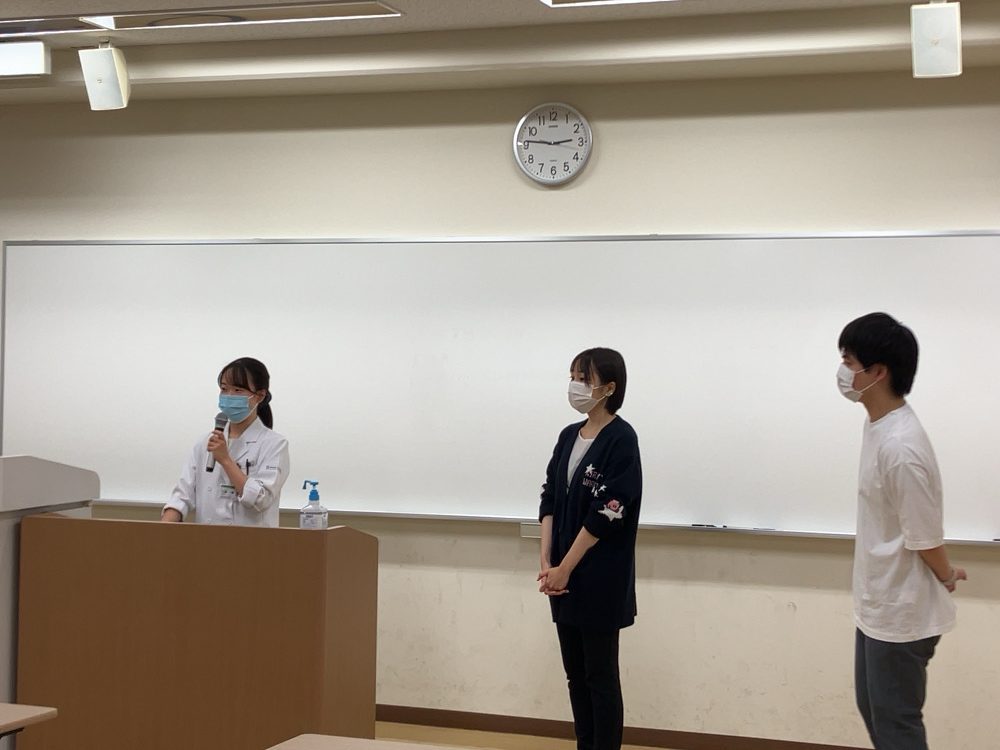 続いて、大手前丸亀高校の卒業生であり、現在は岡山大学医学部医学科に在籍している4~6年生の学生3名からのお話がありました。学生自身も高校生の頃に同じように医学を志し、岡山大学医学科での学びを通じて成長してきた経験を語りました。大学に入学してからの生活や講義・実習のことなど、在校生ならではの視点からのアドバイスは、特に大手前丸亀高校の生徒の皆様にとって大変参考となったのではないでしょうか。