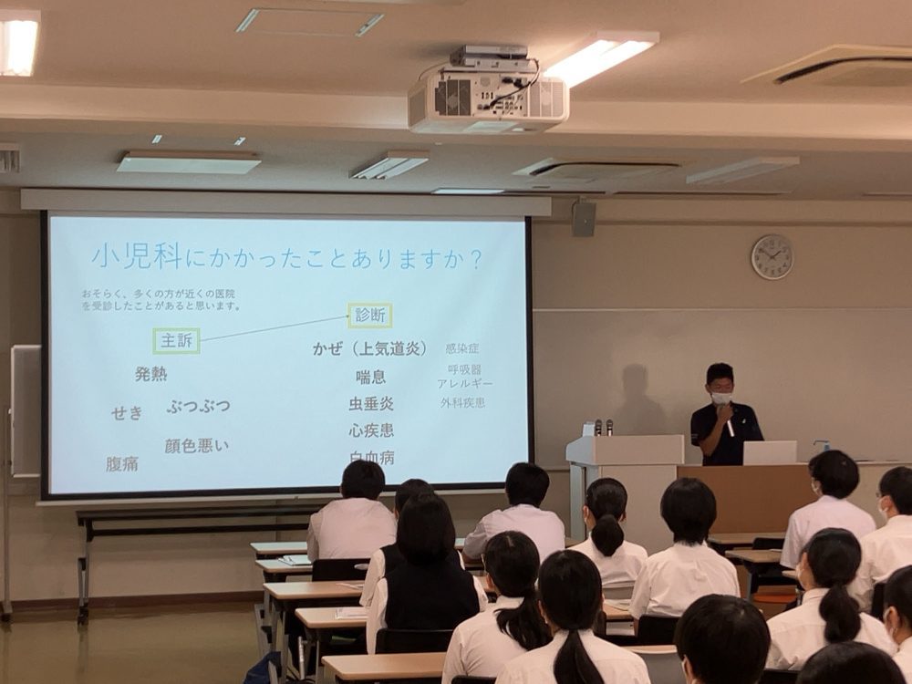 訪問当日は、まず医学科教務担当者から岡山大学医学科のカリキュラムや特徴的なプログラム等についての説明があった後、小児医科学の森本大作先生による特別講義が行われました。森本先生は、小児医療の現場で直面する課題や、医師としてのやりがいについて具体的な事例を交えながらお話しされました。高校生たちは、医師としての使命感や人の命に向き合うことについて深く考える機会となり、真剣な表情で講義を聴いていました。